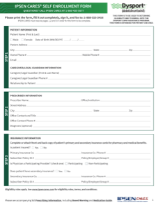 - Patient and HCP download the IPSEN CARES Enrollment Form and complete it at the office. The form is submitted electronically or by printing and faxing it to IPSEN CARES.
