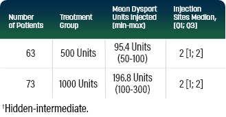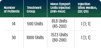 Dysport dosing for adult ULS in the pivotal clinical trial. Units shown indicate the average Dysport dose and specific muscles injected.