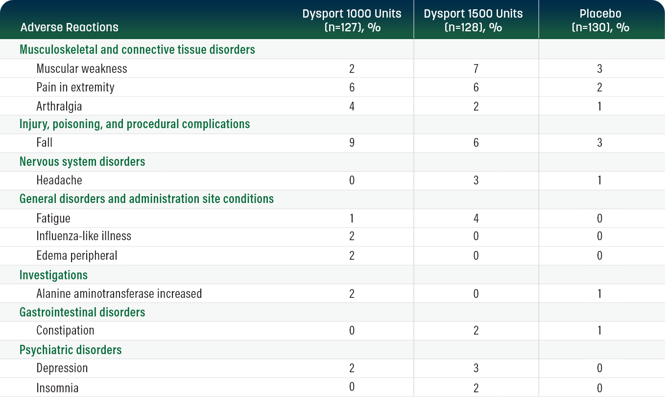 In the open-label phase of the study, in subjects only treated in the lower limb with Dysport, fall and muscular weakness were the most commonly reported treatment-emergent adverse events (TEAEs). In subjects treated in the lower limb only, fall was reported in 4.9% of subjects during Cycle 1, 5.7% during Cycle 2, 1.6% during Cycle 3, and 5.6% during Cycle 4. In subjects treated in the lower limb only, muscular weakness was reported in 6.4% of subjects during Cycle 1, 4.0% during cycle 2, 2.4% during Cycle 3, and 1.4% during Cycle 4. Similarly, the most frequently reported TEAEs in subjects who received 500 Units Dysport in the upper limb alongside 1000 Units in the lower limb were fall (7.7% [8/104] of subjects) and muscular weakness (4.8% [5/104]).2
